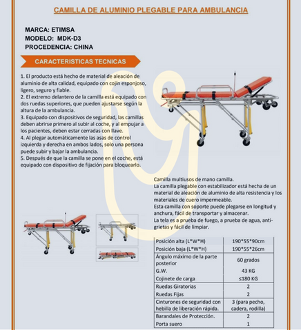 - Compatibilidad con Ambulancias: Diseñada para encajar perfectamente en la mayoría de las ambulancias, facilitando la carga y descarga rápida del paciente.