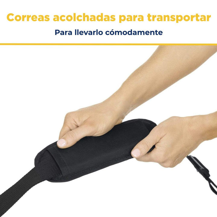 Incluye asas resistentes con envoltura acolchada y una correa para el hombro ajustable y acolchada. La correa puede retirarse fácilmente gracias a sus broches de liberación rápida.