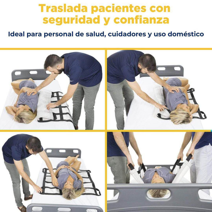 Permite ayudar al paciente a sentarse, girar o ser transferido sin generar tensión excesiva. Reduce el riesgo de lesiones musculares o caídas.